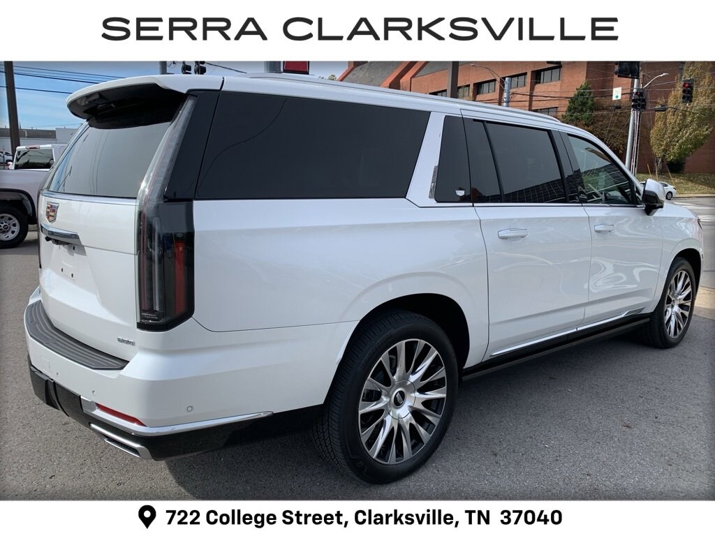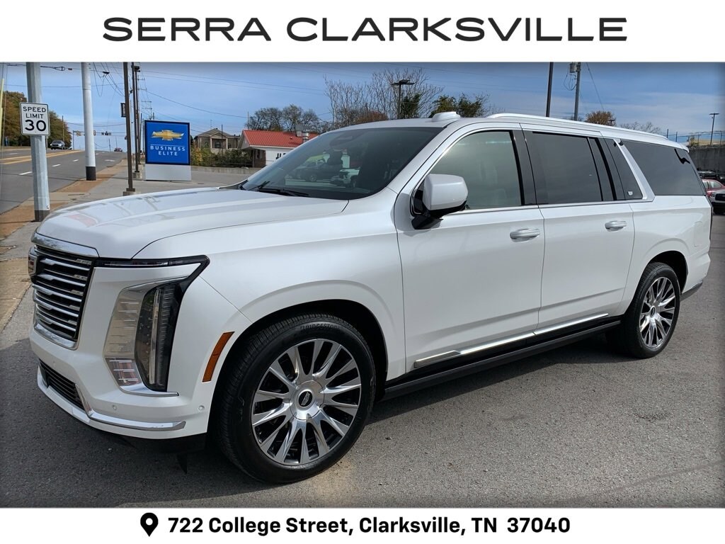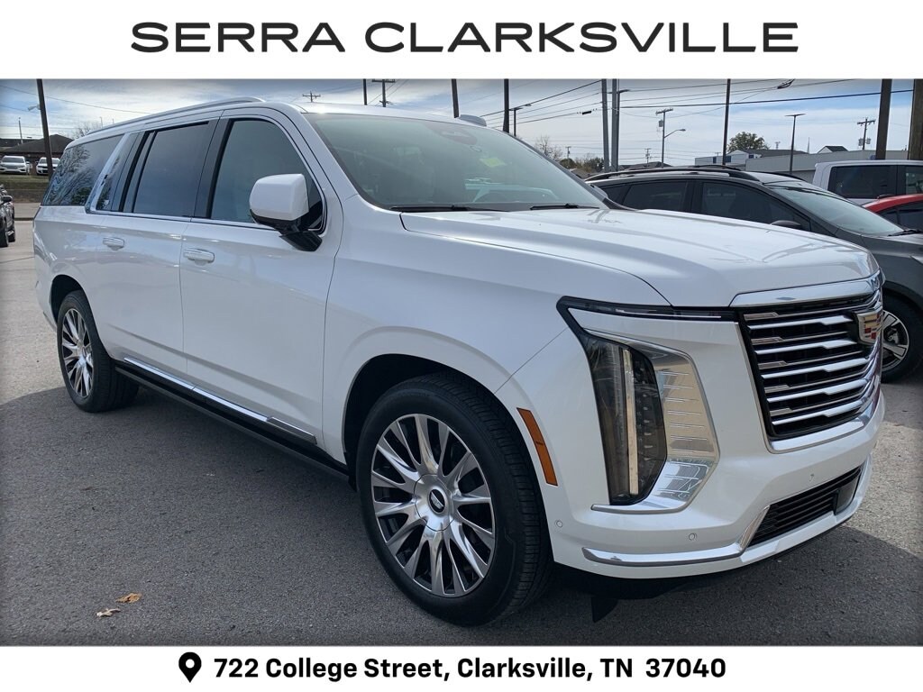 The Pre-Owned 2025 Cadillac Escalade ESV Premium Luxury Platinum with 6.2L V8 at Serra Clarksville. Well equipped: Executive 2nd-Row Seating Package (2nd Row Executive Seats, 2nd Row Floor Console w/Stowable Tray Tables, 2nd Row Portable Device Dual Wireless Charging, 2nd Row Power Massage Seat Adjuster, 2nd Row Ventilated Seats, 4-Way Power Bolster 2nd Row Seat Adjuster, 6-Way Power 2nd Row Seat Adjuster, and Dual Rear USB Ports (Charge-Only)), Preferred Equipment Group 1SG (2-Speed Active Transfer Case, AKG Studio Reference 36-Speaker Audio System, Blind Zone Steering Assist w/Trailering, Door Lock & Latch Shields, Electronic Limited-Slip Differential, Floor Console w/Covered Storage, Front Auxiliary 12-volt Power Outlet, Glass Breakage Sensor, Heated & Ventilated Driver & Front Passenger Seats, Hitch Guidance w/Hitch View, Illuminating Front & Rear Sill Plates, Integrated Trailer Brake Controller, Next Generation Active Noise Cancellation, Night Vision, Platinum Interior Trim, Power Lumbar Massage Driver Seat, Power Lumbar Massage Front Passenger Seat, Power Panoramic Tilt-Sliding Sunroof, Power-Retractable Assist Steps, Rear Seat Entertainment System, Reconfigurable Full-Color Head-Up Display, Smart Trailer Integration Indicator, Theft-Deterrent Alarm System, Trailering App, Trailering Assist Guidelines, Vehicle Inclination Sensor, and Vehicle Interior Movement Sensor), Touring Package (Air Ride Adaptive Suspension, Power Open/Close Doors, and Soft Closing Front & Rear Doors), 4WD, 2-Presets Memory For Driver Seat Adjuster, 3.23 Axle Ratio, 3rd row seats: split-bench, 4-Way Power Driver Lumbar Seat Adjuster, 4-Way Power Front Passenger Lumbar Seat Adjuster, 4-Wheel Disc Brakes, 8-Way Power Driver Seat Adjuster, 8-Way Power Front Passenger Seat Adjuster, ABS brakes, Adaptive suspension, Air Conditioning, Alloy wheels, AM/FM radio: SiriusXM with 360L, Apple CarPlay/Android Auto, Audio memory, Auto High-beam Headlights, Auto tilt-away steering wheel, Auto-dimming door mirrors, Automatic temperature control, Brake assist, Bumpers: body-color, Compass, Cooled Console w/Covered Storage, Delay-off headlights, Driver door bin, Driver Seat Power Bolster, Driver vanity mirror, Dual front impact airbags, Dual front side impact airbags, Electronic Stability Control, Emergency communication system: OnStar Services capable, Exterior Parking Camera Rear, Four wheel independent suspension, Front anti-roll bar, Front Bucket Seats, Front Center Armrest w/Storage, Front dual zone A/C, Front Passenger Seat Power Bolster, Front reading lights, Full Semi-Aniline Leather Seats w/Mini-Chevron, Fully automatic headlights, Garage door transmitter, Genuine wood console insert, Genuine wood dashboard insert, Genuine wood door panel insert, Headphones, Heads-Up Display, Heated door mirrors, Heated Driver & Front Passenger Seats, Heated front seats, Heated rear seats, Heated steering wheel, Illuminated entry, Knee airbag, Lane Departure Warning System, Leather steering wheel, Low tire pressure warning, Magnetic Ride Control Suspension, Memory seat, Navigation System, Night vision lights, Occupant sensing airbag, Outside temperature display, Overhead airbag, Overhead console, Panic alarm, Passenger door bin, Passenger vanity mirror, Power door mirrors, Power driver seat, Power Liftgate, Power moonroof, Power passenger seat, Power steering, Power windows, Radio data system, Radio: Infotainment Experience, Rain sensing wipers, Rear air conditioning, Rear anti-roll bar, Rear audio controls, Rear reading lights, Rear window defroster, Rear window wiper, Remote keyless entry, Security system, SiriusXM w/360L Trial Subscription, Speed control, Split folding rear seat, Spoiler, Steering wheel memory, Steering wheel mounted audio controls, Tachometer, Telescoping steering wheel, Tilt steering wheel, Traction control, Trip compu