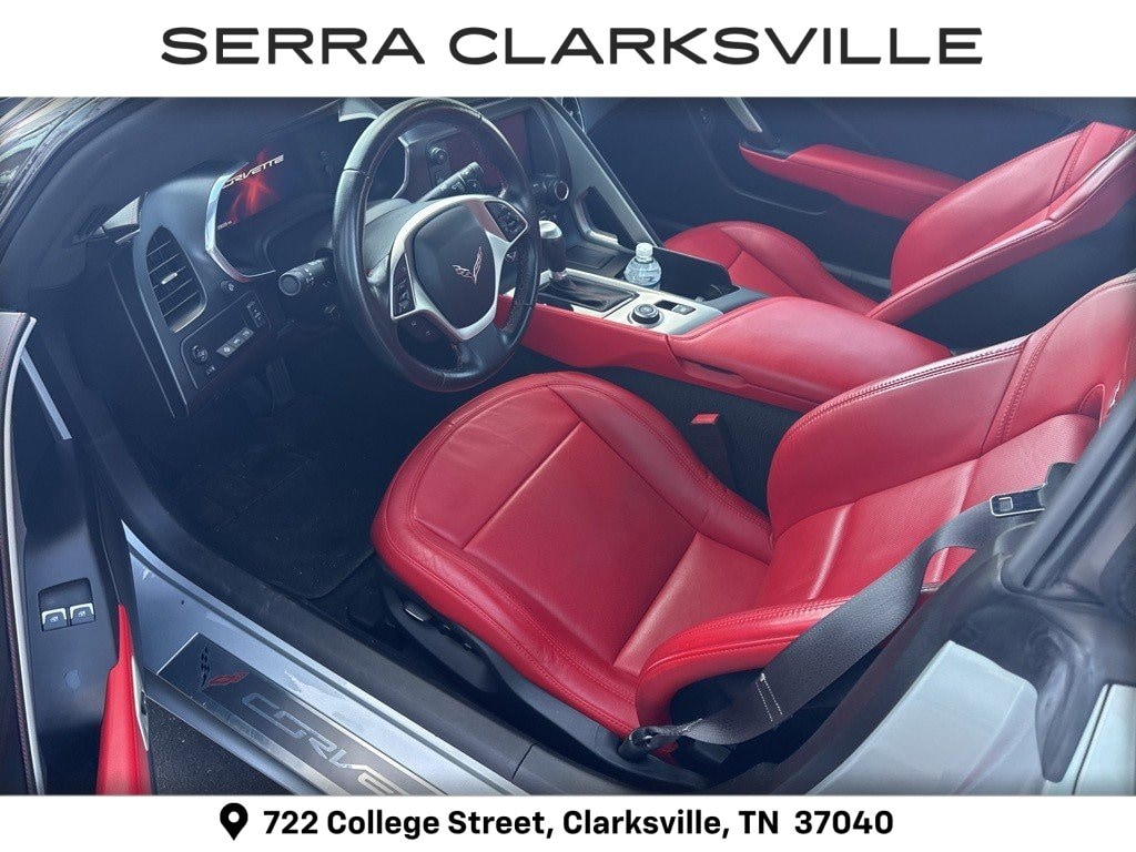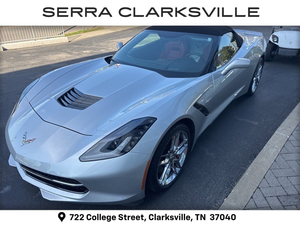 The Pre-Owned 2014 Chevrolet Corvette Stingray Z51 with 6.2L V8 at Serra Clarksville. Well equipped: Battery Protection Package, Memory Package, Preferred Equipment Group 2LT (2LT Interior Trim, Auto-Dimming Inside Frameless Rearview Mirror, Body-Color Outside Heated Power-Adjustable Mirrors, Cargo Net, Head-Up Display, Heated & Vented Driver & Passenger Seats, Power Lumbar/Bolster Seat Adjusters, Radio: Chevrolet MyLink AM/FM Stereo, Theft Deterrent System, and Universal Home Remote), 2.73 Limited Slip Performance Rear Axle Ratio, 4-Wheel Disc Brakes, 8-Way Driver & Passenger Seat Adjusters, 9 Speakers, ABS brakes, Air Conditioning, Alloy wheels, AM/FM radio: SiriusXM, Automatic temperature control, Bose Premium 9-Speaker Audio System Feature, Bumpers: body-color, Compass, Convertible roof lining, Delay-off headlights, Driver door bin, Driver vanity mirror, Dual front impact airbags, Dual front side impact airbags, Electronic Stability Control, Emergency communication system: OnStar Directions & Connections, Exterior Parking Camera Rear, Four wheel independent suspension, Front anti-roll bar, Front Bucket Seats, Front Center Armrest, Front dual zone A/C, Front License Plate Bracket, Front reading lights, Fully automatic headlights, Glass rear window, GT Bucket Seats, Heated door mirrors, High-Intensity Discharge Headlights, Illuminated entry, Leather Shift Knob, Leather steering wheel, Low tire pressure warning, Mulan Perforated Leather Seating Surfaces, Navigation System, Occupant sensing airbag, Outside temperature display, Panic alarm, Passenger door bin, Passenger vanity mirror, Performance Exhaust, Power convertible roof, Power door mirrors, Power driver seat, Power passenger seat, Power steering, Power windows, Premium audio system: Chevrolet MyLink, Radio data system, Rear anti-roll bar, Rear window defroster, Red Painted Calipers, Remote keyless entry, Remote Vehicle Starter System, SiriusXM Satellite Radio, Speed control, Speed-sensing steering, Spoiler, Sport steering wheel, Steering wheel mounted audio controls, Tachometer, Telescoping steering wheel, Tilt steering wheel, Traction control, Trip computer, Variably intermittent wipers, Voltmeter, Wheels: 19 x 8.5 Fr & 20 x 10 Rr 5-Split Spoke, and Wheels: 19 x 8.5 Fr & 20 x 10 Rr Chrome Alum.