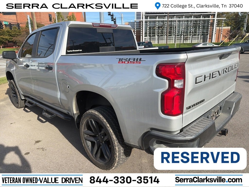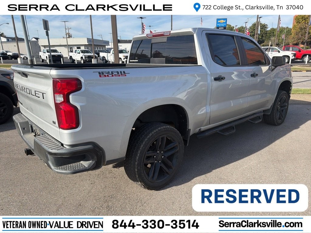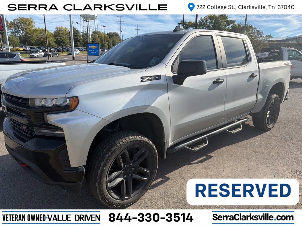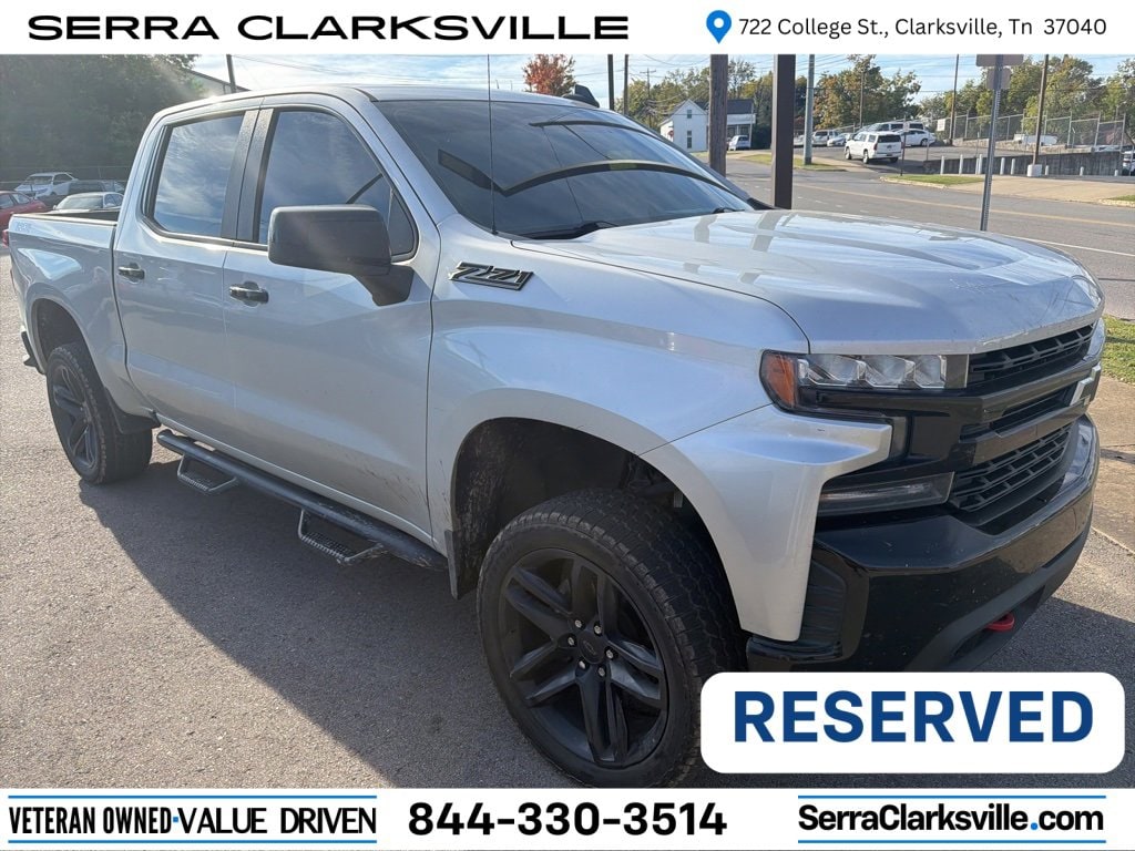 The Pre-Owned 2020 Chevrolet Silverado 1500 LT Trail Boss with EcoTec3 5.3L V8 at Serra Clarksville. Well equipped: Cloth Rear Seat w/Storage Package, Convenience Package II (120-Volt Bed Mounted Power Outlet, 120-Volt Instrument Panel Power Outlet, 2 USB Ports, HD Radio, HD Rear Vision Camera, Power Sliding Rear Window w/Rear Defogger, Premium Bose 7-Speaker Sound System, Radio: Chevrolet Infotainment 3 Plus System, SiriusXM w/360L, and Universal Home Remote), Convenience Package w/Buckets Seats (10-Way Power Driver Seat w/Lumbar, Dual-Zone Automatic Climate Control, Floor Mounted Center Console, Front Bucket Seats, Heated Driver & Front Outboard Passenger Seats, Heated Steering Wheel, and Manual Tilt/Telescoping Steering Column), Preferred Equipment Group 2LT (12-Volt Rear Auxiliary Power Outlet, 170 Amps Alternator, 2 USB Ports (First Row), 4-Way Manual Driver Seat Adjuster, 4.2 Diagonal Color Display Driver Info Center, 4G LTE Wi-Fi Hot Spot Capable, 6-Speaker Audio System, All-Weather Floor Liner (LPO) (AAK), Auxiliary External Transmission Oil Cooler, Bluetooth® For Phone, Chevrolet Connected Access Capable, Color-Keyed Carpeting Floor Covering, Compass, Deep-Tinted Glass, Dual Exhaust w/Polished Outlets, Electric Rear-Window Defogger, Electrical Lock Control Steering Column, Front LED Fog Lamps, Heavy-Duty Rear Locking Differential, High Gloss Black Grille, High Gloss Black Mirror Caps, Hitch Guidance, Keyless Open & Start, Leather Wrapped Steering Wheel, LED Cargo Area Lighting, LED Reflector Headlamps, Manual Tilt-Wheel Steering Column, OnStar & Chevrolet Connected Services Capable, Performance Red Recovery Hooks, Power Door Locks, Power Front Windows w/Driver Express Up/Down, Power Front Windows w/Passenger Express Down, Power Rear Windows w/Express Down, Rear 60/40 Folding Bench Seat (Folds Up), Rear Dual USB Charging-Only Ports, Rear Vision Camera, Remote Vehicle Starter System, Single-Zone Manual/Semi-Automatic Air Conditioning, Steering Wheel Audio Controls, Steering Wheel Mounted Electronic Cruise Control, and Theft Deterrent System (Unauthorized Entry)), Suspension Package (High Capacity Air Filter and Hill Descent Control), Trailering Package, 10-Speed Automatic, 4WD, Black Cloth, 3.23 Rear Axle Ratio, 4-Wheel Disc Brakes, 40/20/40 Front Split-Bench Seat, 6 Speakers, ABS brakes, Air Conditioning, Alloy wheels, AM/FM radio: SiriusXM, Apple CarPlay/Android Auto, Brake assist, Cloth Seat Trim, Delay-off headlights, Driver door bin, Driver vanity mirror, Dual front impact airbags, Dual front side impact airbags, Electronic Stability Control, Front anti-roll bar, Front Center Armrest w/Storage, Front fog lights, Front reading lights, Front wheel independent suspension, Fully automatic headlights, Heated door mirrors, Illuminated entry, Integrated Trailer Brake Controller, Low tire pressure warning, Occupant sensing airbag, Off-Road Suspension w/2 Lift, Outside temperature display, Overhead airbag, Overhead console, Panic alarm, Passenger door bin, Passenger vanity mirror, Power door mirrors, Power steering, Power Sunroof, Power windows, Radio data system, Radio: Chevrolet Infotainment 3 System, Rear reading lights, Rear step bumper, Rear window defroster, Remote keyless entry, Security system, Speed control, Speed-sensing steering, Split folding rear seat, Steering wheel mounted audio controls, Tachometer, Tilt steering wheel, Traction control, Trip computer, Variably intermittent wipers, Voltmeter, and Wheels: 18 x 8.5 Black Painted Aluminum.