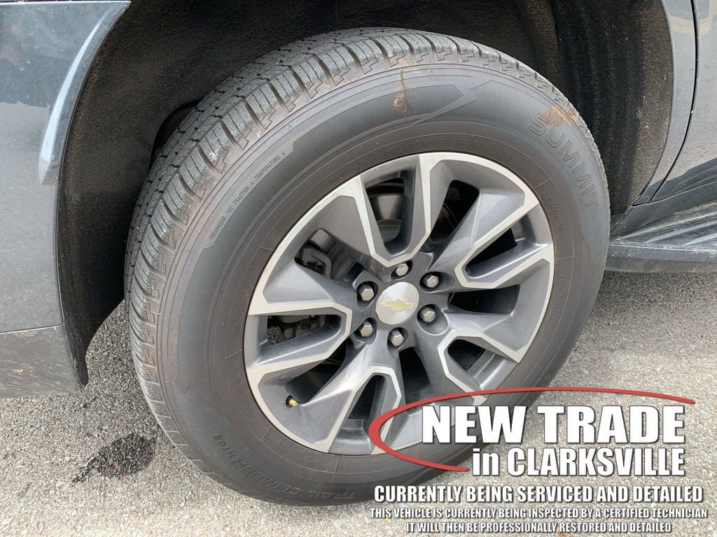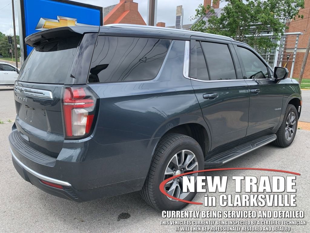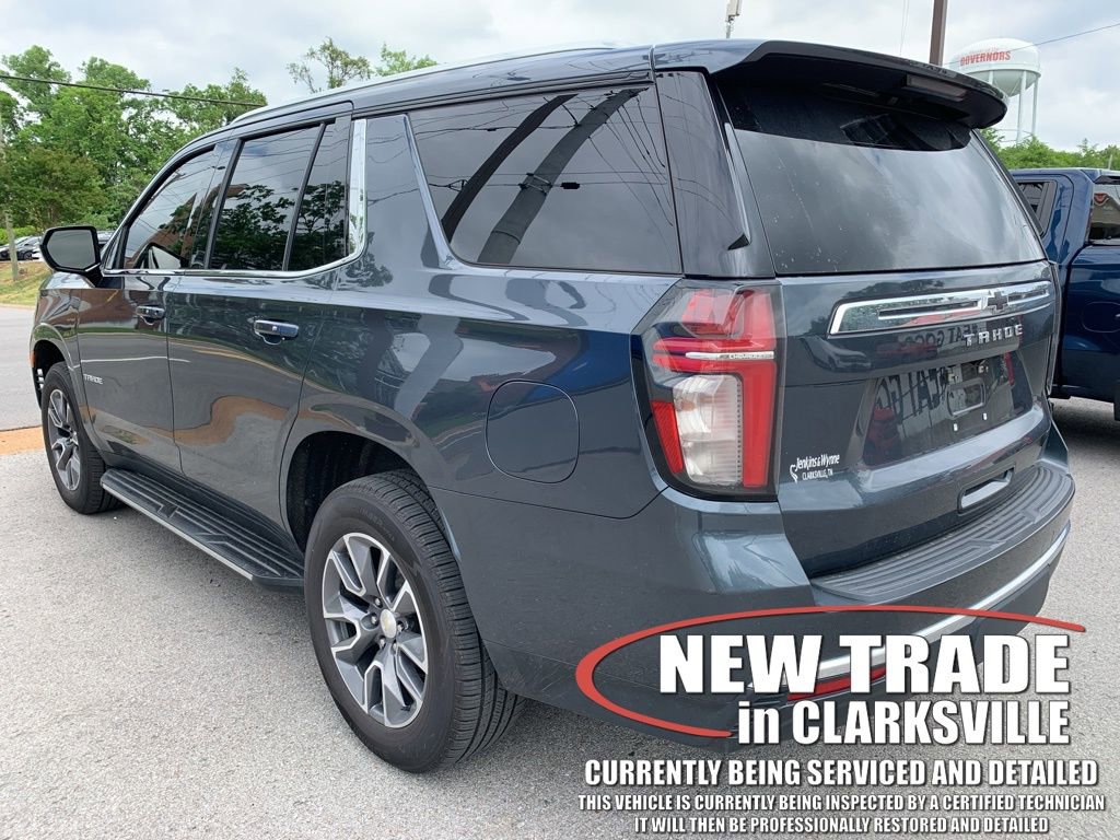 The Pre-Owned 2021 Chevrolet Tahoe LS with EcoTec3 5.3L V8 at Serra Clarksville. Well equipped: Preferred Equipment Group 1LS (1st & 2nd Row Color-Keyed Carpeted Floor Mats, 2 USB Data Ports, Color-Keyed Carpeting Floor Covering, Driver & Front Outboard Passenger Airbags, Floor Console w/Storage Area, HD Radio, Infotainment Display, Leather-Wrapped Steering Wheel, LED Daytime Running Lamps, Remote Start, and SiriusXM Radio w/360L), 4WD, Gideon/Very Dark Atmosphere Cloth, 3.23 Rear Axle Ratio, 3rd row seats: split-bench, 4-Wheel Disc Brakes, 6 Speakers, 6-Speaker Audio System Feature, ABS brakes, Air Conditioning, Alloy wheels, AM/FM radio: SiriusXM with 360L, Apple CarPlay/Android Auto, Auto High-beam Headlights, Automatic temperature control, Brake assist, Bumpers: body-color, Compass, Delay-off headlights, Driver door bin, Driver vanity mirror, Dual front impact airbags, Dual front side impact airbags, Electronic Stability Control, Emergency communication system: OnStar and Chevrolet connected services capable, Four wheel independent suspension, Front anti-roll bar, Front Bucket Seats, Front Center Armrest, Front dual zone A/C, Front High-Back Reclining Bucket Seats, Front reading lights, Fully automatic headlights, Heated door mirrors, Illuminated entry, Leather steering wheel, Low tire pressure warning, Occupant sensing airbag, Outside temperature display, Overhead airbag, Overhead console, Panic alarm, Passenger door bin, Passenger vanity mirror, Power door mirrors, Power driver seat, Power passenger seat, Power steering, Power windows, Premium audio system: Chevrolet Infotainment 3, Premium Cloth Seat Trim, Premium Smooth Ride Suspension, Radio: Chevrolet Infotainment 3 Plus System, Rain sensing wipers, Rear air conditioning, Rear anti-roll bar, Rear reading lights, Rear seat center armrest, Rear window defroster, Rear window wiper, Remote keyless entry, Roof rack: rails only, Security system, Speed control, Speed-sensing steering, Split folding rear seat, Spoiler, Steering wheel mounted audio controls, Tachometer, Telescoping steering wheel, Tilt steering wheel, Traction control, Trip computer, Variably intermittent wipers, Voltmeter, and Wheels: 18 x 8.5 Bright Silver Painted Aluminum.