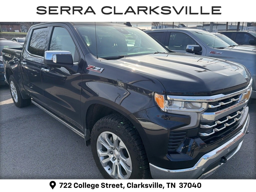 The Pre-Owned 2024 Chevrolet Silverado 1500 LTZ with EcoTec3 5.3L V8 at Serra Clarksville. Well equipped: High Capacity Suspension Package, LTZ Convenience Package (2 USB Data Ports, Floor Mounted Center Console, Power Tilt & Telescoping Steering Column, Premium Bose 7-Speaker Sound System, Ventilated Driver & Front Passenger Seats, and Wireless Charging), LTZ Convenience Package II (2nd Row Heated Outboard Seats, Adaptive Cruise Control, Power Sliding Rear Window w/Rear Defogger, and Universal Home Remote), LTZ Plus Package, LTZ Premium Package (Power Sunroof), Preferred Equipment Group 1LZ (10-Way Power Driver Seat w/Lumbar, 10-Way Power Passenger Seat Adjuster w/Lumbar, 12.3 Multicolor Reconfigurable Digital Display, 120-Volt Bed Mounted Power Outlet, 120-Volt Interior Power Outlet, Auto-Dimming Inside Rear-View Mirror, Auto-Locking Rear Differential, Bluetooth® For Phone, Chevrolet Connected Access Capable, Chrome Mirror Caps, Color-Keyed Carpeting Floor Covering, Deep-Tinted Glass, Driver Memory, Dual Rear USB Ports (Charge Only), Electric Rear-Window Defogger, Electrical Steering Column Lock, Electronic Cruise Control, Front Frame-Mounted Black Recovery Hooks, Front LED Fog Lamps, Front Rain-Sensing Wipers, Front Rubberized Vinyl Floor Mats, Heated Driver & Front Outboard Passenger Seats, Heated Steering Wheel, Hitch Guidance w/Hitch View, In-Vehicle Trailering System App, Integrated Trailer Brake Controller, Keyless Open & Start, LED Cargo Area Lighting, OnStar & Chevrolet Connected Services Capable, Outside Heated Power-Adjustable Mirrors, Power Front Passenger Windows w/Express Up/Down, Power Front Windows w/Driver Express Up/Down, Power Rear Windows w/Express Down, Power Tailgate, Rear Rubberized-Vinyl Floor Mats, Rear Wheelhouse Liners, Remote Vehicle Starter System, SiriusXM w/360L, Standard Tailgate, Steering Wheel Audio Controls, Theft Deterrent System (Unauthorized Entry), Wi-Fi Hot Spot Capable, and Wrapped Steering Wheel), Safety Package (HD Surround Vision, Perimeter Lighting, Rear Cross Traffic Braking, Rear Pedestrian Alert, Safety Alert Seat, Trailer Camera Provisions, Trailer Side Blind Zone Alert, and Ultrasonic Front & Rear Park Assist), Technology Package (15 Diagonal Multicolor Head-Up Display, Bed View Camera, and Rear Camera Mirror), Trailering Package (Hitch Guidance), Up-Level Rear Seat w/Storage Package, Z71 Off-Road Package (Dual Exhaust w/Polished Outlets, Heavy-Duty Air Filter, Hill Descent Control, and Off-Road Suspension), 10-Speed Automatic, 4WD, Gideon/Very Dark Atmosphere Leather, 170 Amp Alternator, 3.23 Rear Axle Ratio, 4-Wheel Disc Brakes, 7 Speakers, ABS brakes, Air Conditioning, Alloy wheels, AM/FM radio: SiriusXM with 360L, Auto High-beam Headlights, Auto-dimming door mirrors, Auto-dimming Rear-View mirror, Automatic Emergency Braking, Automatic temperature control, Brake assist, Bumpers: chrome, Chevytec Spray-On Black Bedliner, Compass, Delay-off headlights, Driver door bin, Driver vanity mirror, Dual front impact airbags, Dual front side impact airbags, Electronic Stability Control, Electronic Transmission Range Selector Shifter, Following Distance Indicator, Forward Collision Alert, Front anti-roll bar, Front Bucket Seats, Front Center Armrest, Front dual zone A/C, Front fog lights, Front Pedestrian Braking, Front reading lights, Front wheel independent suspension, Fully automatic headlights, Heated door mirrors, Heated front seats, Heated steering wheel, Illuminated entry, IntelliBeam Automatic High Beam On/Off, Lane Keep Assist w/Lane Departure Warning, Low tire pressure warning, Memory seat, Occupant sensing airbag, Outside temperature display, Overhead airbag, Overhead console, Panic alarm, Passenger door bin, Passenger vanity mirror, Perforated Leather-Appointed Front Seat Trim, Power door mirrors, Power driver seat, Power passenger se