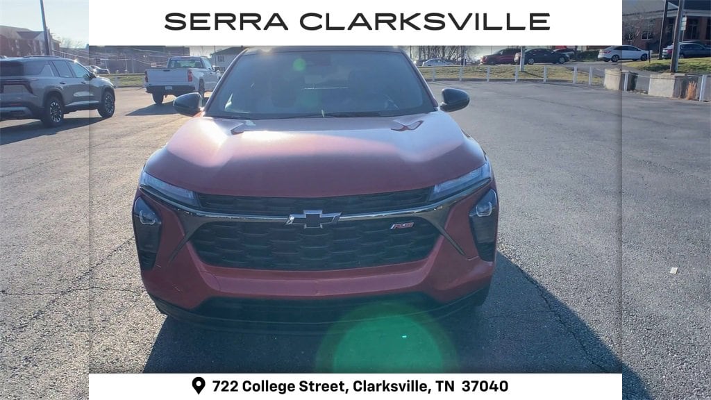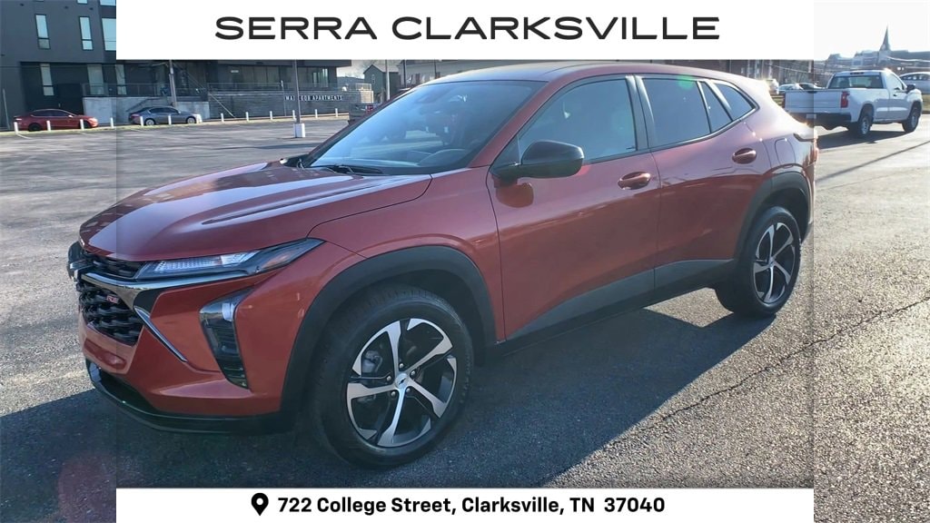 The Pre-Owned 2024 Chevrolet Trax 1RS with 1.2L Ecotec Turbo DOHC DI w/VVT at Serra Clarksville. Well equipped: Preferred Equipment Group 1RS, 2-Way Adjustable Front Head Restraints, 3.50 Final Drive Axle Ratio, 4 Speakers, 4-Speaker Audio System Feature, 4-Way Manual Front Passenger Seat Adjuster, 4-Wheel Disc Brakes, 6-Way Manual Driver Seat Adjuster, ABS brakes, Air Conditioning, Alloy wheels, AM/FM radio: SiriusXM, Auto High-beam Headlights, Brake assist, Bumpers: body-color, Cloth Seat Trim, Compass, Delay-off headlights, Driver door bin, Driver vanity mirror, Dual front impact airbags, Dual front side impact airbags, Electronic Stability Control, Emergency communication system: OnStar and Chevrolet connected services capable, Exterior Parking Camera Rear, Front anti-roll bar, Front Bucket Seats, Front Center Armrest, Front reading lights, Front wheel independent suspension, Fully automatic headlights, Heated door mirrors, Heated Driver & Front Passenger Seats, Heated front seats, Heated steering wheel, Illuminated entry, Low tire pressure warning, Occupant sensing airbag, Outside temperature display, Overhead airbag, Overhead console, Panic alarm, Passenger door bin, Passenger vanity mirror, Power door mirrors, Power steering, Power windows, Premium audio system: Chevrolet Infotainment 3, Radio data system, Radio: Chevrolet Infotainment 3 System w/AM/FM, Rear window defroster, Rear window wiper, Remote keyless entry, Security system, SiriusXM, Speed control, Split folding rear seat, Spoiler, Sport steering wheel, Steering wheel mounted audio controls, Tachometer, Telescoping steering wheel, Tilt steering wheel, Traction control, Trip computer, Variably intermittent wipers, and Wheels: 18 Black-Painted Machined Aluminum.