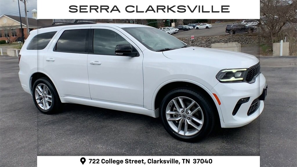 CARFAX One-Owner. Clean CARFAX. White Knuckle Clearcoat 2023 Dodge Durango GT PlusThe Pre-Owned 2023 Dodge Durango GT Plus with 3.6L V6 24V VVT at Serra Clarksville. Well equipped: Quick Order Package 2BG GT Plus (1-Year Trial (Registration Required), 10.1 Touchscreen Display, 115V Auxiliary Power Outlet, 180 Amp Alternator, 4G LTE Wi-Fi Hot Spot, 7 & 4 Pin Wiring Harness, Adaptive Cruise Control w/Stop, Apple CarPlay, Auto-Dimming Exterior Driver Mirror, Black Roof Rails, Class IV Receiver Hitch, Connected Travel & Traffic Services, Disassociated Touchscreen Display, Dual Remote USB Port - Charge Only, Exterior Mirrors w/Heating Element, Exterior Mirrors w/Memory, Exterior Mirrors w/Supplemental Signals, Floor Console w/Leather Armrest, Full Speed Forward Collision Warning Plus, Gloss Black Exterior Mirrors, Google Android Auto, GPS Antenna Input, GPS Navigation, HD Radio, Heated Second Row Seats, Heavy-Duty Engine Cooling, Integrated Center Stack Radio, Integrated Roof Rail Crossbars, Integrated Voice Command w/Bluetooth, Leather Trimmed Bucket Seats, Leather Wrapped Door Panels, LED Auxiliary Low Beam & Turn Signal, Power 6x9 Multi-Function Foldaway Mirrors, Power 8-Way Driver Memory 8-Way Passenger Seats, Power Driver/Passenger 4-Way Lumbar Adjust, Power Sunroof, Power Tilt & Telescopic Steering Column, Premium LED Fog Lamps, Radio: Uconnect 5 Nav w/10.1 Display, Radio/Driver Seat/Mirrors Memory, Rear Load Leveling Suspension, Red Accent Stitching, SiriusXM Guardian - Included Trial (B), SiriusXM w/360L, Trailer Brake Control, USB Host Flip, and Ventilated Front Seats), AWD, 3.45 Rear Axle Ratio, 3rd row seats: split-bench, 4-Wheel Disc Brakes, 6 Speakers, ABS brakes, Air Conditioning, Alloy wheels, AM/FM radio: SiriusXM, Apple CarPlay/Android Auto, Auto-dimming Rear-View mirror, Automatic temperature control, Brake assist, Bumpers: body-color, Cloth Bucket Seats w/Shift Insert, Compass, Delay-off headlights, Driver door bin, Driver vanity mirror, Dual front impact airbags, Dual front side impact airbags, Electronic Stability Control, Four wheel independent suspension, Front anti-roll bar, Front Bucket Seats, Front Center Armrest w/Storage, Front dual zone A/C, Front License Plate Bracket, Front reading lights, Fully automatic headlights, Garage door transmitter, Heated door mirrors, Heated front seats, Heated steering wheel, Illuminated entry, Knee airbag, Leather steering wheel, Low tire pressure warning, Manufacturer's Statement of Origin, Occupant sensing airbag, Outside temperature display, Overhead airbag, Overhead console, Panic alarm, ParkView Rear Back-Up Camera, Passenger door bin, Passenger vanity mirror, Power door mirrors, Power driver seat, Power Liftgate, Power steering, Power windows, Radio data system, Radio: Uconnect 4 w/8.4 Display, Rear air conditioning, Rear anti-roll bar, Rear reading lights, Rear seat center armrest, Rear window defroster, Rear window wiper, Remote keyless entry, SiriusXM Radio Service, SiriusXM Satellite Radio, Speed control, Speed-sensing steering, Speed-Sensitive Wipers, Split folding rear seat, Spoiler, Sport steering wheel, Steering wheel mounted audio controls, Tachometer, Telescoping steering wheel, Tilt steering wheel, Traction control, Trip computer, Variably intermittent wipers, Voltmeter, and Wheels: 20 x 8.0 Fine Silver.AWD 3.6L V6 24V VVT 8-Speed Automatic