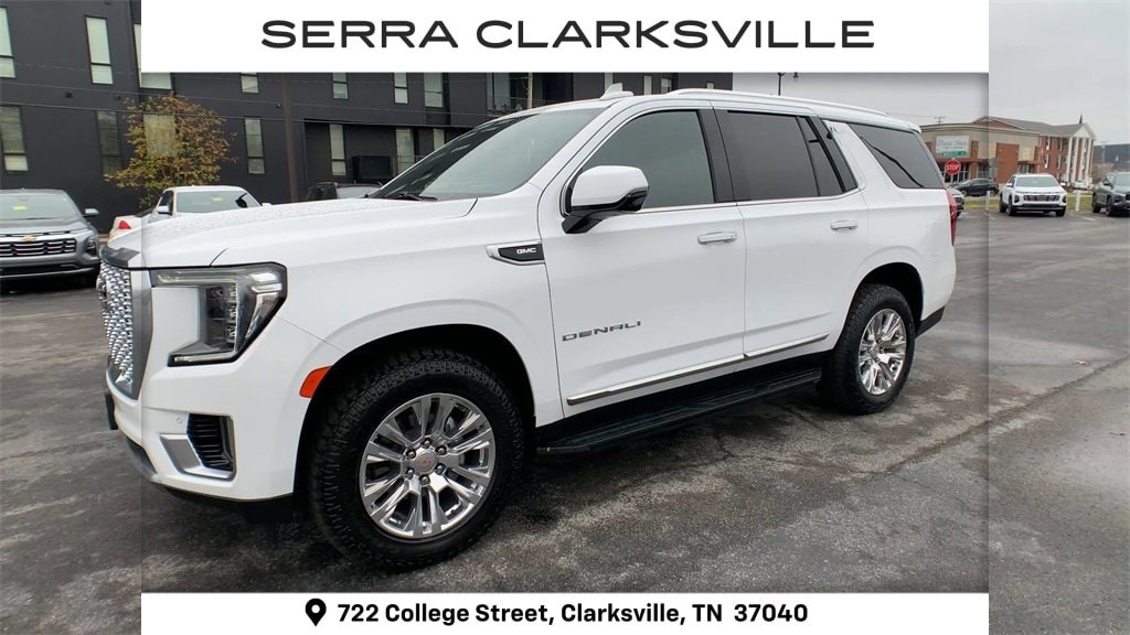 The Pre-Owned 2024 GMC Yukon Denali with EcoTec3 6.2L V8 at Serra Clarksville. Well equipped: License Plate Front Mounting Package, Preferred Equipment Group 5SA (12-Way Power Seat Adjusters, 15 Diagonal Multi-Color Head-Up Display, 2 Presets For Outside Rearview Mirrors, 3rd Row 60/40 Power-Folding Split-Bench Seat, Adaptive Cruise Control, Bose 14-Speaker Surround w/CenterPoint, Bright Front & Rear Door Sill Plates, Chrome Door Handles w/Body-Color Strip, Dual Exhaust System, Enhanced Automatic Emergency Braking, Floor Console, Galvano Bodyside Moldings, Hands-Free Power Programmable Rear Liftgate, HD Surround Vision, Heated 2nd Row Outboard Position Seats, Heated Driver & Front Passenger Seats, Heated Steering Wheel, Hill Descent Control, Inside Rear-View Auto-Dimming Mirror, Outside Heated Power-Adjustable Mirrors, Perforated Heated & Ventilated Dr & Frt Pass Seats, Power Release 2nd Row Bucket Seats, Power Tilt & Telescopic Steering Column, Rear Pedestrian Alert, Safety Alert Seat, Universal Home Remote, and Wireless Charging), 4WD, 14 Speakers, 3.23 Rear Axle Ratio, 3rd row seats: split-bench, 4-Wheel Disc Brakes, ABS brakes, Adaptive suspension, Air Conditioning, Alloy wheels, AM/FM radio: SiriusXM with 360L, AM/FM Stereo, Apple CarPlay/Android Auto, Auto High-beam Headlights, Auto-dimming door mirrors, Auto-dimming Rear-View mirror, Auto-leveling suspension, Automatic Emergency Braking, Automatic temperature control, Bodyside moldings, Brake assist, Bumpers: body-color, Compass, Delay-off headlights, Driver door bin, Driver vanity mirror, Dual front impact airbags, Dual front side impact airbags, Electronic Stability Control, Emergency communication system: OnStar and GMC connected services capable, Following Distance Indicator, Forward Collision Alert, Four wheel independent suspension, Front & Rear Park Assist, Front anti-roll bar, Front Bucket Seats, Front Center Armrest, Front dual zone A/C, Front fog lights, Front Pedestrian Braking, Front reading lights, Fully automatic headlights, Garage door transmitter, Heads-Up Display, Heated door mirrors, Heated front seats, Heated rear seats, Heated steering wheel, Illuminated entry, IntelliBeam Automatic High Beam On/Off, Lane Change Alert w/Side Blind Zone Alert, Lane Keep Assist w/Lane Departure Warning, Low tire pressure warning, Magnetic Ride Control Suspension, Memory seat, Navigation System, Occupant sensing airbag, Outside temperature display, Overhead airbag, Overhead console, Panic alarm, Passenger door bin, Passenger vanity mirror, Perforated Leather Seating Surfaces, Power door mirrors, Power driver seat, Power Liftgate, Power passenger seat, Power steering, Power windows, Rain sensing wipers, Rear air conditioning, Rear anti-roll bar, Rear Cross Traffic Alert, Rear reading lights, Rear window defroster, Rear window wiper, Remote keyless entry, Roof rack: rails only, Security system, SiriusXM w/360L, Speed control, Speed-sensing steering, Split folding rear seat, Spoiler, Steering wheel memory, Steering wheel mounted audio controls, Tachometer, Telescoping steering wheel, Tilt steering wheel, Traction control, Trip computer, Turn signal indicator mirrors, Variably intermittent wipers, Ventilated front seats, Voltmeter, and Wheels: 20 x 9 6-Spoke Polished Aluminum.