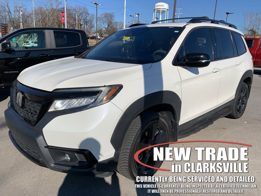The Pre-Owned 2019 Honda Passport Elite with 3.5L V6 24V SOHC i-VTEC at Serra Clarksville. Well equipped: 10 Speakers, 4-Wheel Disc Brakes, 4.334 Axle Ratio, A/V remote: CabinControl, ABS brakes, Air Conditioning, Alloy wheels, AM/FM radio: SiriusXM, Apple CarPlay/Android Auto, Auto High-beam Headlights, Auto-dimming door mirrors, Auto-dimming Rear-View mirror, Automatic temperature control, Blind Spot Information (BSI) System warning, Brake assist, Bumpers: body-color, Compass, Delay-off headlights, Driver door bin, Driver vanity mirror, Driver's Seat Mounted Armrest, Dual front impact airbags, Dual front side impact airbags, Electronic Stability Control, Emergency communication system: HondaLink, Exterior Parking Camera Rear, Forward collision: Collision Mitigation Braking System (CMBS) + FCW mitigation, Four wheel independent suspension, Front anti-roll bar, Front Bucket Seats, Front Center Armrest, Front dual zone A/C, Front fog lights, Front reading lights, Fully automatic headlights, Garage door transmitter: HomeLink, Heated & Ventilated Front Bucket Seats, Heated door mirrors, Heated front seats, Heated rear seats, Heated steering wheel, Illuminated entry, Lane departure: Lane Keeping Assist System (LKAS) active, Low tire pressure warning, Memory seat, Navigation system: Honda Satellite-Linked Navigation System, Occupant sensing airbag, Outside temperature display, Overhead airbag, Overhead console, Panic alarm, Passenger door bin, Passenger seat mounted armrest, Passenger vanity mirror, Perforated Leather-Trimmed Seats, Power door mirrors, Power driver seat, Power Liftgate, Power moonroof, Power passenger seat, Power steering, Power windows, Radio data system, Radio: 540-Watt Premium Audio System w/10 Speakers, Rain sensing wipers, Rear air conditioning, Rear anti-roll bar, Rear reading lights, Rear seat center armrest, Rear window defroster, Rear window wiper, Remote keyless entry, Roof rack: rails only, Security system, Speed control, Speed-sensing steering, Split folding rear seat, Spoiler, Steering wheel mounted audio controls, Tachometer, Telescoping steering wheel, Tilt steering wheel, Traction control, Trip computer, Turn signal indicator mirrors, Variably intermittent wipers, Ventilated front seats, and Wheels: 20 Solid-Spoke Gloss Black Alloy.