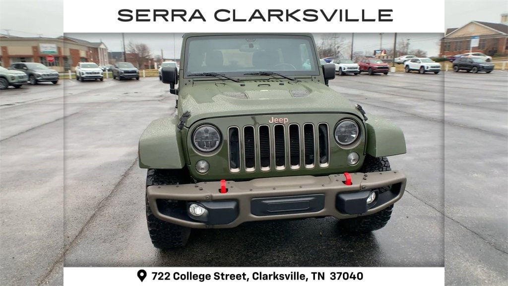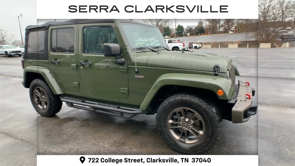 The Pre-Owned 2016 Jeep Wrangler Unlimited Sahara with 3.6L V6 24V VVT at Serra Clarksville. Well equipped: Connectivity Group (Leather Wrapped Steering Wheel, Remote USB Port, Tire Pressure Monitoring Display, Uconnect Voice Command w/Bluetooth, and Vehicle Information Center), Jeep 75th Anniversary Package, Quick Order Package 24H 75th Anniversary (2 Front & 1 Rear Bronze Tow Hook, 75th Anniversary Badge, Anti-Spin Differential Rear Axle, Body Color Grille w/Bronze Accent, Bronze Jeep Grille Badge, Bronze Trail Rated Badge, Chrome/Leather Wrapped Shift Knob, Heated Front Seats, Hood w/Power Dome, Leather Seat w/Cloth (Ombre Mesh), Low Gloss Black Wrangler Decal, MOPAR Slush Mats, Moroccan Sun Instrument Panel Bezel, Moroccan Sun Interior Accents, Painted Front Bumper, Painted Rear Bumper, Premium Black Sunrider Soft Top, Sunrider Soft Top, and Wheels: 17 x 7.5 Aluminum Bronze), 18 x 7.5 Polished Satin Carbon Wheels, 3.21 Rear Axle Ratio, 4-Wheel Disc Brakes, 40GB Hard Drive w/28GB Available, 5-Year SiriusXM Travel Link Service, 6.5 Touchscreen Display, 8 Speakers, ABS brakes, Air Conditioning, Alloy wheels, AM/FM radio: SiriusXM, Audio Jack Input for Mobile Devices, Auto-dimming Rear-View mirror, Brake assist, CD player, Cloth Seats w/Adjustable Head Restraints, Compass, Driver door bin, Driver vanity mirror, Dual front impact airbags, Electronic Stability Control, Front anti-roll bar, Front Bucket Seats, Front Center Armrest w/Storage, Front fog lights, Front reading lights, Fully automatic headlights, GPS Navigation, Heated door mirrors, Heavy Duty Suspension w/Gas Shocks, Illuminated entry, Integrated roll-over protection, Leather steering wheel, Low tire pressure warning, Manufacturer's Statement of Origin, Occupant sensing airbag, Outside temperature display, Panic alarm, Passenger door bin, Passenger vanity mirror, Power door mirrors, Power steering, Power windows, Radio data system, Radio: 130, Radio: 430 (DISC), Radio: 430N, Rear anti-roll bar, Remote keyless entry, Remote Start System, Security system, SiriusXM Travel Link, Speed control, Split folding rear seat, Steering wheel mounted audio controls, Tachometer, Tilt steering wheel, Traction control, Trip computer, and Variably intermittent wipers.