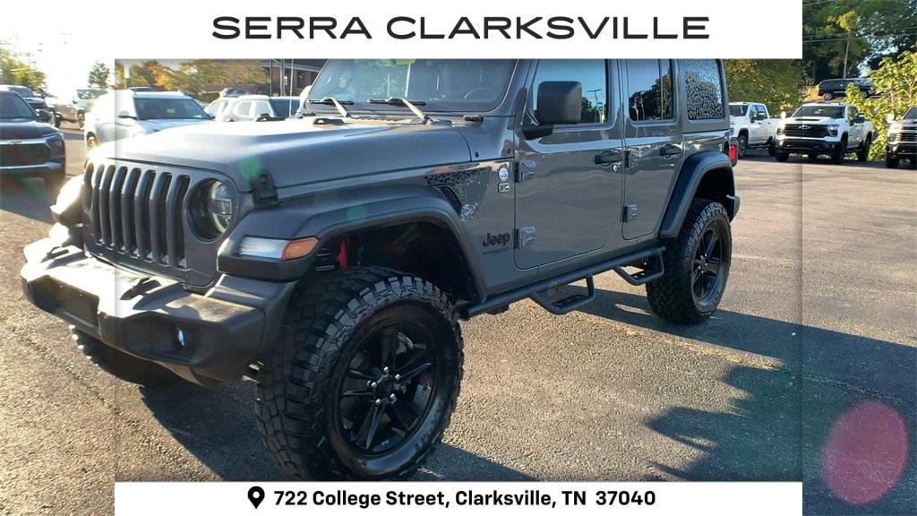 Local new car trade-in! The Pre-Owned 2020 Jeep Wrangler Unlimited Sport Altitude with 3.6L V6 24V VVT at Serra Clarksville. Well equipped: Altitude Package, Cold Weather Group (Heated Front Seats and Heated Steering Wheel), Convenience Group (Universal Garage Door Opener), LED Headlamp & Fog Lamp Group (Front LED Fog Lamps and LED Reflector Headlamps), Quick Order Package 24L Altitude (Anti-Lock 4-Wheel Disc HD Brakes, Automatic Headlamps, Black 3-Piece Hard Top, Black Interior Accents, Body Color Grille w/Gloss Black, Bridgestone Brand Tires, Deep Tint Sunscreen Windows, Freedom Panel Storage Bag, Front 1-Touch Down Power Windows, Heavy Duty Suspension w/Gas Shocks, Leather Wrapped Steering Wheel, Matte Black Jeep Badge, MOPAR Hardtop Headliner, No Soft Top, Power Heated Mirrors, Rear Window Defroster, Rear Window Wiper/Washer, Remote Keyless Entry, Security Alarm, Speed Sensitive Power Locks, Sun Visors w/Illuminated Vanity Mirrors, Wheels: 18 x 7.5 Gloss Black Aluminum, Wizard Black Instrument Panel Bezels, and Wrangler Decal), Technology Group (1-Year SiriusXM Radio Service, 7.0 Touchscreen Display, Air Conditioning w/Auto Temperature Control, Air Filtering, Cluster 7.0 TFT Color Display, GPS Antenna Input, Integrated Center Stack Radio, Radio: Uconnect 4 w/7 Display, SiriusXM Satellite Radio, and USB Host Flip), Trailer Tow & HD Electrical Group (240 Amp Alternator, 7 & 4 Pin Wiring Harness, 700 Amp Maintenance Free Battery, Auxiliary Switches, and Class II Receiver Hitch), 3.45 Rear Axle Ratio, 4-Wheel Disc Brakes, 8 Speakers, ABS brakes, Air Conditioning, AM/FM radio, Apple CarPlay (DISC), Aux Battery, Brake assist, Cloth Low-Back Bucket Seats, Compass, Delay-off headlights, Driver door bin, Driver vanity mirror, Dual front impact airbags, Dual front side impact airbags, Electronic Stability Control, Front anti-roll bar, Front Bucket Seats, Front Center Armrest w/Storage, Front fog lights, Front reading lights, Google Android Auto (DISC), Integrated roll-over protection, Integrated Voice Command w/Bluetooth, Low tire pressure warning, MOPAR All-Weather Floor Mats (DISC), Non-Lock Fuel Cap w/o Discriminator, Normal Duty Suspension, Occupant sensing airbag, Outside temperature display, ParkView Rear Back-Up Camera, Passenger door bin, Passenger vanity mirror, Power steering, Radio data system, Radio: Uconnect 3 w/5 Display, Rear anti-roll bar, Rear reading lights, Speed control, Split folding rear seat, Steering wheel mounted audio controls, Stop-Start Dual Battery System, Tachometer, Telescoping steering wheel, Tilt steering wheel, Traction control, Trip computer, Variably intermittent wipers, and Wheels: 17 x 7.5 Black Steel Styled.