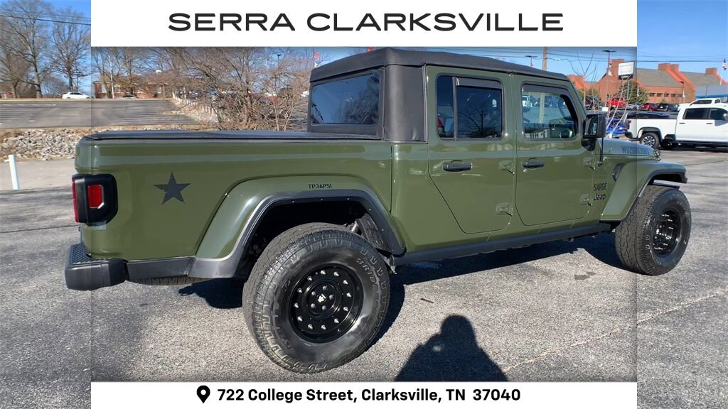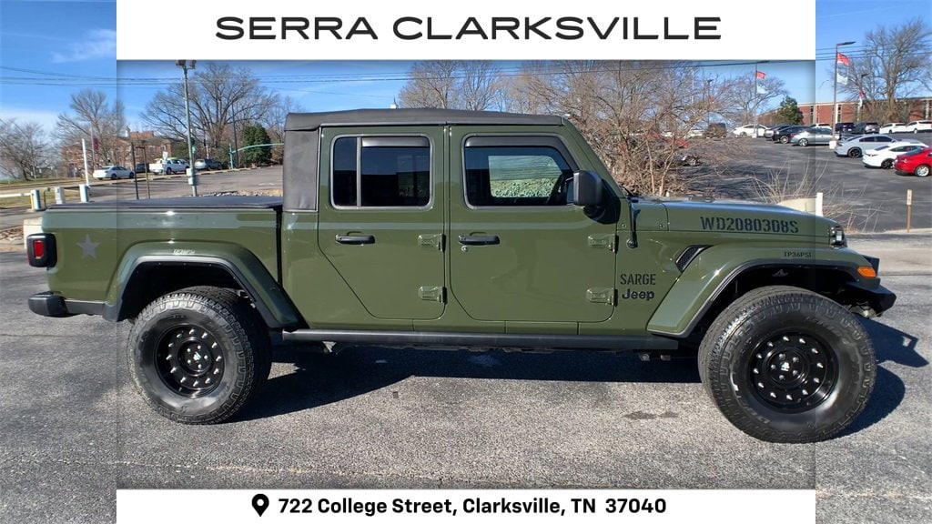 The Pre-Owned 2022 Jeep Gladiator Sport with 3.6L V6 24V VVT at Serra Clarksville. Well equipped: Convenience Group, LED Headlamp & Fog Lamp Group, Max Tow Package w/4.10 Axle Ratio (240 Amp Alternator and Anti-Spin Differential Rear Axle), Popular Equipment Package (Black 3-Piece Hard Top), Quick Order Package 23S Sport S (Body Color Fender Flares (2-Piece), Power Tailgate Lock, and Wheels: 17 x 7.5 Tech Silver Aluminum), Quick Order Package 24S Sport S, Trailer Tow Package, 110 MPH Vehicle Max Speed Calibration, 4-Wheel Disc Brakes, 8 Speakers, ABS brakes, Air Conditioning, AM/FM radio, Apple CarPlay, Apple CarPlay/Android Auto, Brake assist, Cloth Low-Back Bucket Seats, Compass, Corning Gorilla Glass, Delay-off headlights, Driver door bin, Driver vanity mirror, Dual front impact airbags, Dual front side impact airbags, Electronic Stability Control, Emergency communication system: SiriusXM Guardian, Front anti-roll bar, Front Bucket Seats, Front Center Armrest w/Storage, Front fog lights, Front reading lights, Google Android Auto, GPS Antenna Input, Integrated Center Stack Radio, Integrated roll-over protection, Integrated Voice Command w/Bluetooth, Low tire pressure warning, MOPAR All-Weather Slush Mats, No Soft Top, Normal Duty Suspension, Occupant sensing airbag, Outside temperature display, ParkView Rear Back-Up Camera, Passenger door bin, Passenger vanity mirror, Power steering, Radio data system, Radio: Uconnect 4 w/7 Display, Rear anti-roll bar, Rear reading lights, Speed control, Split folding rear seat, Steering wheel mounted audio controls, Tachometer, Telescoping steering wheel, Tilt steering wheel, Traction control, Trip computer, USB Host Flip, Variably intermittent wipers, and Wheels: 17 x 7.5 Black Steel Styled.