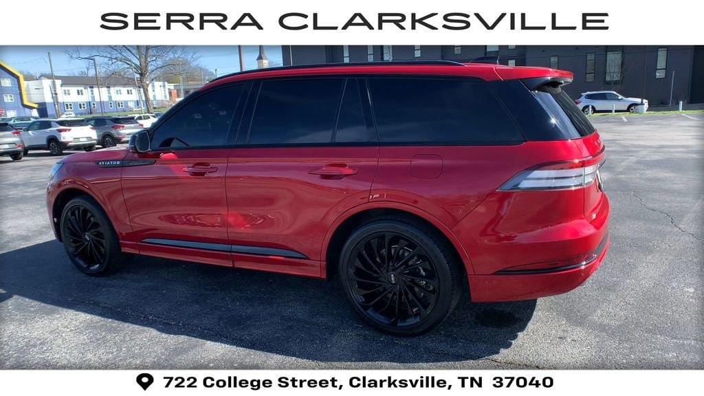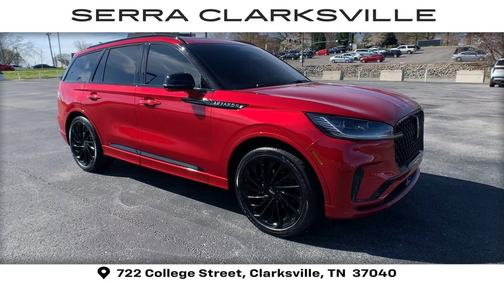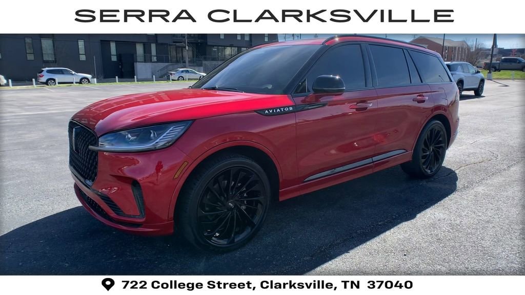 The Pre-Owned 2025 Lincoln Aviator Reserve with 3.0L V6 at Serra Clarksville. Well equipped: Equipment Group 200A (Advanced Heads-Up Display, Auto Air Refresh, Lincoln BlueCruise Equipped (4-Years Included), and Wireless Charging Pad), Illumination Package (Adaptive Dynamic Bending Lighting, Adaptive Pixel LED Headlamps, Illuminated Lincoln Star in Grille, Lincoln Dynamic Signature Lighting, and Speed Dependent Lighting), Jet Appearance Package (40/Mini Console/40 Dual Captain's Chairs, Black Exterior Elements, Body-Color Exterior Elements, and Wheels: 22 Black Aluminum w/Adaptive Suspension), 14 Speakers, 3rd row seats: split-bench, 4-Wheel Disc Brakes, ABS brakes, Adaptive suspension, Air Conditioning, Alloy wheels, AM/FM radio: SiriusXM, Apple CarPlay/Android Auto, Audio memory, Auto High-beam Headlights, Auto-dimming door mirrors, Auto-dimming Rear-View mirror, Automatic temperature control, Brake assist, Bumpers: body-color, Compass, Delay-off headlights, Driver door bin, Driver vanity mirror, Dual front impact airbags, Dual front side impact airbags, Electronic Stability Control, Emergency communication system: 911 Assist, Four wheel independent suspension, Front anti-roll bar, Front Bucket Seats, Front Center Armrest, Front dual zone A/C, Front reading lights, Full Rear Console, Fully automatic headlights, Garage door transmitter, Genuine wood console insert, Genuine wood dashboard insert, Heads-Up Display, Heated door mirrors, Heated front seats, Heated steering wheel, HVAC memory, Illuminated entry, Knee airbag, Leather steering wheel, Lincoln Digital Experience, Low tire pressure warning, Memory seat, Navigation system: Connected Navigation (1-year trial), Occupant sensing airbag, Outside temperature display, Overhead airbag, Overhead console, Panic alarm, Passenger door bin, Passenger vanity mirror, Power door mirrors, Power driver seat, Power Liftgate, Power moonroof: Panoramic Vista Roof, Power passenger seat, Power steering, Power windows, Premium Lthr Heated/Ventilated Fnt Captain's Chairs, Radio data system, Radio: Revel Audio System w/14 Speakers, Rain sensing wipers, Rear air conditioning, Rear anti-roll bar, Rear audio controls, Rear dual zone A/C, Rear reading lights, Rear window defroster, Rear window wiper, Remote keyless entry, Security system, SiriusXM, Speed control, Speed-Sensitive Wipers, Split folding rear seat, Spoiler, Steering wheel memory, Steering wheel mounted A/C controls, Steering wheel mounted audio controls, Tachometer, Telescoping steering wheel, Tilt steering wheel, Traction control, Trip computer, Turn signal indicator mirrors, Variably intermittent wipers, Ventilated front seats, and Wheels: 21 Bright-Machined Aluminum.
