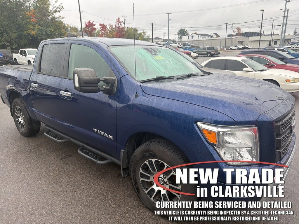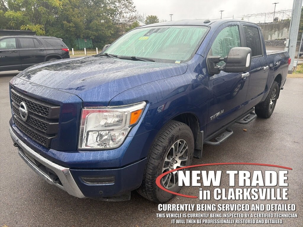 One-owner local new car trade-in! Clean CARFAX. The Pre-Owned 2021 Nissan Titan SV with 5.6L V8 DOHC 32V 400hp at Serra Clarksville. Well equipped: Off Road Protection Package (All Season Floor Mats), SV Convenience Package (110V/12V Outlets In Back Of Center Console, 2 Illuminated USB-A Ports In Back Of Center Console, Auto-Dimming Rear-View Mirror, Chrome Interior Door Locks, Convex Spotter Mirror, Dedicated Cell Phone Holder, Dual Zone Automatic HVAC, Front & Rear Parking Sensors, Heated Front Captain's Chairs, Intelligent Key System, Leather-Wrapped Steering Wheel, Power Sliding Rear Window w/Defogger, Radio: NissanConnect w/Navigation, Rear HVAC Vents, Remote Engine Start on Key Fob, and Traffic Sign Recognition (TSR)), SV Tow Package (4-Pin/7-Pin Wiring Harness Connector (Rear Bumper), Heated Manually Extendable Tow Mirrors, Puddle Lamps, Receiver Hitch, Trailer Brake Controller, and Trailer Light Check Function On Key Fob), SV Utility Package (110V Outlet in Bed, Auto-Dimming Rearview Mirror w/UGDO, Electronic Locking Tailgate, Flat Floor Function w/Tie Down Hooks, LED Tailgate Area Illumination, LED Under Rail Bed Lighting, Rain Sensing Wipers, Rear Utility Bed Step, Spray-On Bedliner, Universal Garage Door Opener, and Utilitrack System w/4 Tie-Down Cleats), 4WD, 3.692 Axle Ratio, 4-Wheel Disc Brakes, 6 Speakers, ABS brakes, Air Conditioning, Alloy wheels, AM/FM radio: SiriusXM, Auto High-beam Headlights, Blind Spot Warning, Brake assist, Bumpers: chrome, Carpet Floor Mats (L95), Cloth Seat Trim, Driver door bin, Driver vanity mirror, Dual front impact airbags, Dual front side impact airbags, Electronic Stability Control, Electronic Tailgate Lock Deletion, Emergency communication system: NissanConnect Services, Front anti-roll bar, Front Center Armrest w/Storage, Front reading lights, Front Split Bench Seat (40/20/40), Front wheel independent suspension, Fully automatic headlights, Heated door mirrors, Illuminated entry, Knee airbag, Loop Side Steps, Low tire pressure warning, NissanConnect featuring Apple CarPlay and Android Auto, Occupant sensing airbag, Outside temperature display, Overhead airbag, Overhead console, Panic alarm, Passenger door bin, Passenger vanity mirror, Power door mirrors, Power steering, Power windows, Radio data system, Radio: NissanConnect AM/FM, Rear anti-roll bar, Rear Bumper Step w/Electronic Tailgate Lock, Rear Parking Sensors, Rear seat center armrest, Rear step bumper, Rear window defroster, Remote keyless entry, Security system, Speed control, Speed-sensing steering, Speed-Sensitive Wipers, Splash Guards, Split folding rear seat, Steering wheel mounted audio controls, Tachometer, Telescoping steering wheel, Tilt steering wheel, Traction control, Trip computer, Variably intermittent wipers, Voltmeter, Wheels: 18 x 8 Silver Painted Alloy, and Wheels: 20 x 8 Chrome.