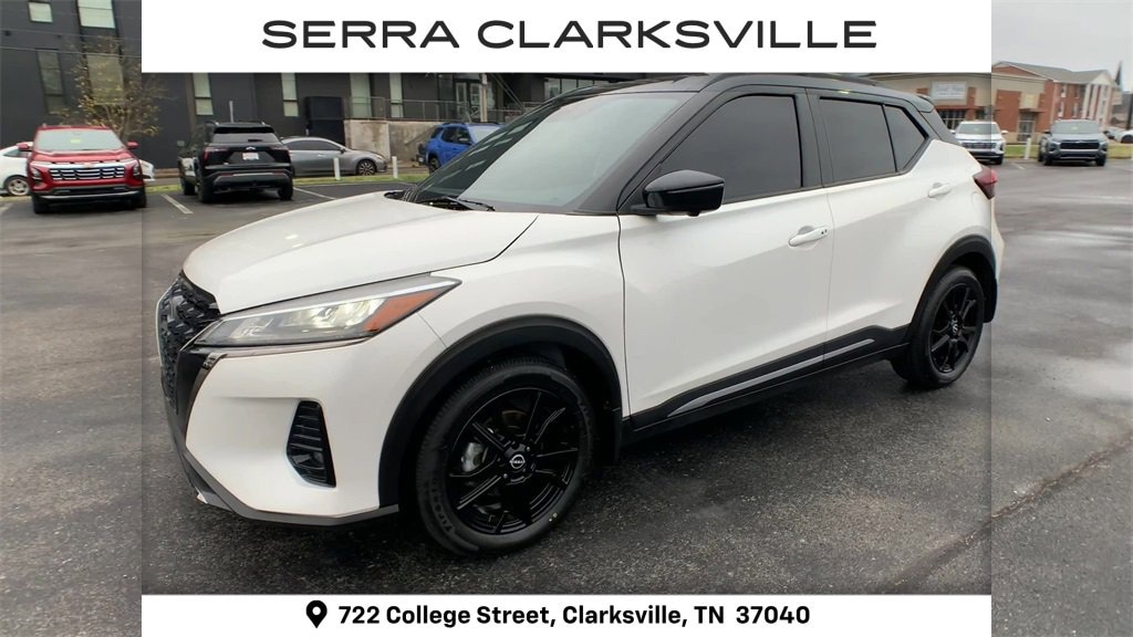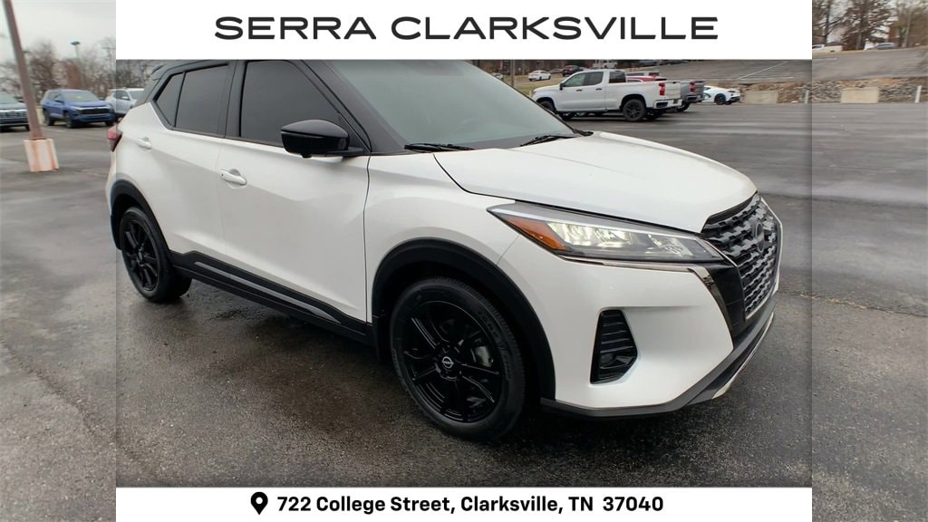 The Pre-Owned 2024 Nissan Kicks SR with 1.6L 4-Cylinder DOHC 16V at Serra Clarksville. Well equipped: SR Premium Package (Bose Personal Plus Audio System, Heated Front Seats, Heated Steering Wheel, Prima-Tex Appointed Seat Trim, Security System, and Tonneau Cover), 3.93 Axle Ratio, 4-Wheel Disc Brakes, 6 Speakers, ABS brakes, Air Conditioning, Alloy wheels, AM/FM radio: SiriusXM, Apple CarPlay/Android Auto, Auto High-beam Headlights, Automatic temperature control, Blind Spot Warning, Brake assist, Bumpers: body-color, Carpeted Floor Mats w/Cargo Mat, Cloth Seat Trim, Delay-off headlights, Driver door bin, Driver vanity mirror, Dual front impact airbags, Dual front side impact airbags, Electronic Stability Control, Exterior Parking Camera Rear, Front anti-roll bar, Front Bucket Seats, Front Center Armrest, Front fog lights, Front reading lights, Front wheel independent suspension, Fully automatic headlights, Heated door mirrors, Illuminated entry, Knee airbag, Leather steering wheel, Low tire pressure warning, Occupant sensing airbag, Outside temperature display, Overhead airbag, Panic alarm, Passenger door bin, Passenger vanity mirror, Power door mirrors, Power steering, Power windows, Radio data system, Radio: AM/FM Audio System, Rear Parking Sensors, Rear reading lights, Rear side impact airbag, Rear window defroster, Rear window wiper, Remote keyless entry, Speed control, Splash Guards Grain (4 Piece), Split folding rear seat, Sport steering wheel, SR Rear Roof Spoiler, Steering wheel mounted audio controls, Tachometer, Telescoping steering wheel, Tilt steering wheel, Traction control, Trip computer, Turn signal indicator mirrors, USB Charging Cable Set - Nissan, Variably intermittent wipers, Wheels: 17 Alloy (5-Hole), and Wheels: 17 Black Alloy.