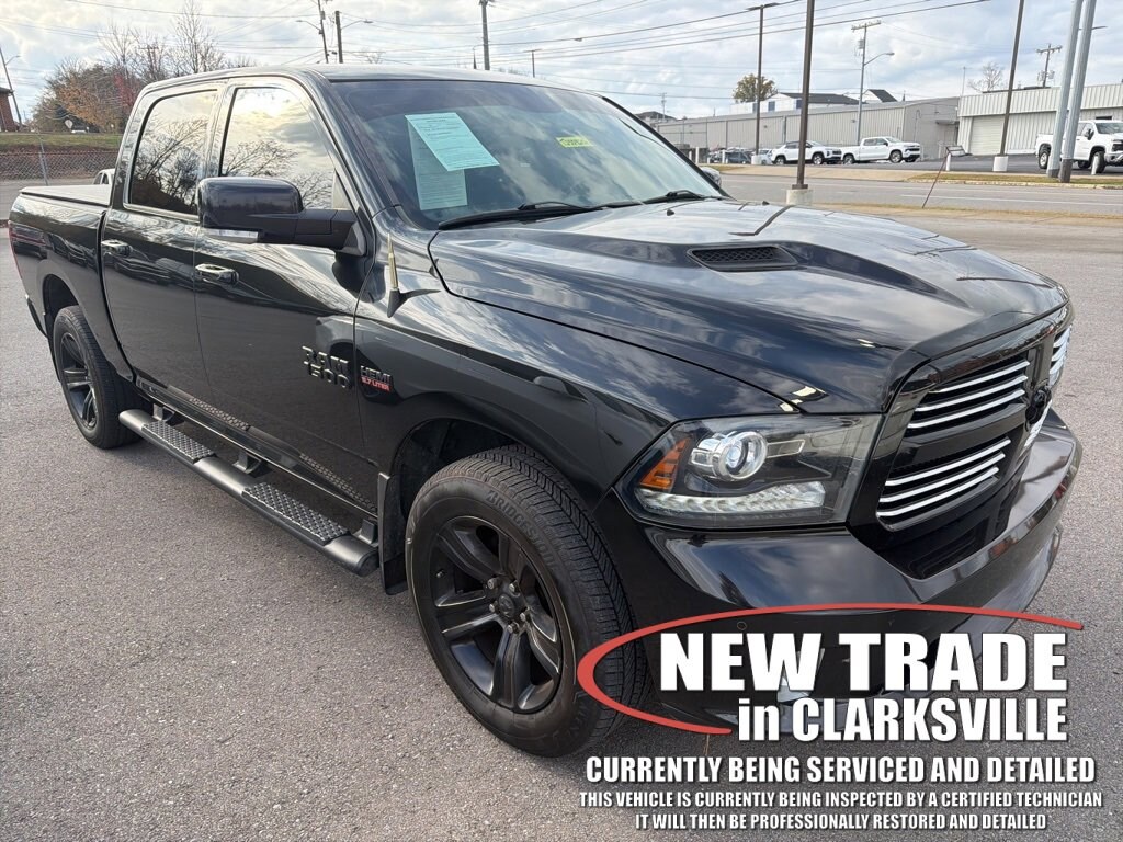 Local new car trade-in! Clean CARFAX. The Pre-Owned 2016 Ram 1500 Sport with HEMI 5.7L V8 Multi Displacement VVT at Serra Clarksville. Well equipped: Black Ram 1500 Sport Group (4x4 Flat Black Badge, 9 Alpine Speakers w/Subwoofer, Air Conditioning ATC w/Dual Zone Control, Bi-Function Halogen Projector Headlamps, Black Ram Head Tailgate Badge, Body Color/Bright Billets Grille, Flat Black 5.7L Hemi Badge, Flat Black Ram 1500 Badge, Sport Performance Hood, and Wheels: 20 x 9 Semi-Gloss Black Aluminum), Convenience Group (Auto High Beam Headlamp Control, Keyless Enter-N-Go, Rain Sensitive Windshield Wipers, and Remote Proximity Keyless Entry), Premium Sound Group, Quick Order Package 26L Sport, Remote Start & Security Alarm Group (Remote Start System and Security Alarm), 1 Yr. Trial (Registration Required), 115V Auxiliary Power Outlet, 20 x 9 Polished Aluminum Wheels, 32 Gallon Fuel Tank, 4-Wheel Disc Brakes, 5-Year SiriusXM Traffic Service, 5-Year SiriusXM Travel Link Service, 6 Speakers, 8.4 Touchscreen Display, ABS brakes, Adjustable pedals, Air Conditioning, Alloy wheels, AM/FM radio, Anti-Spin Differential Rear Axle, Auto-dimming door mirrors, Auto-dimming Rear-View mirror, Automatic temperature control, Brake assist, Bucket Seats, Bumpers: body-color, Class IV Receiver Hitch, Cloth Bucket Seats, Compass, Delay-off headlights, Driver door bin, Driver vanity mirror, Dual front impact airbags, Dual front side impact airbags, Electronic Stability Control, Emergency communication system: Uconnect Access, Folding Flat Load Floor Storage, Front anti-roll bar, Front Bucket Seats, Front Center Armrest w/Storage, Front dual zone A/C, Front fog lights, Front reading lights, Front wheel independent suspension, Full Length Upgraded Floor Console, Fully automatic headlights, Garage door transmitter, GPS Antenna Input, GPS Navigation, HD Radio, Heated door mirrors, Heated Front Seats, Heated front seats, Heated steering wheel, High Back Seats, Illuminated entry, Integrated Voice Command w/Bluetooth, Leather steering wheel, Leather Trimmed Bucket Seats, LED Bed Lighting, Low tire pressure warning, Media Hub (SD, USB, AUX), Occupant sensing airbag, Outside temperature display, Overhead airbag, Overhead console, Panic alarm, ParkSense Front/Rear Park Assist System, ParkView Rear Back-Up Camera, Passenger door bin, Passenger vanity mirror, Power 10-Way Driver & 6-Way Passenger Seats, Power door mirrors, Power driver seat, Power Lumbar Adjust, Power steering, Power Sunroof, Power windows, Radio data system, Radio: Uconnect 8.4, Radio: Uconnect 8.4 NAV, Rear 60/40 Split Folding Seat, Rear anti-roll bar, Rear seat center armrest, Rear step bumper, Remote keyless entry, SIRIUSXM Satellite Radio, SIRIUSXM Traffic, SiriusXM Travel Link, Speed control, Split folding rear seat, Steering wheel mounted audio controls, Tachometer, Tilt steering wheel, Traction control, Trailer Brake Control, Trip computer, Turn signal indicator mirrors, Uconnect Access, Uconnect Access 1 Year Trial, Variably intermittent wipers, Ventilated Front Seats, and Voltmeter.