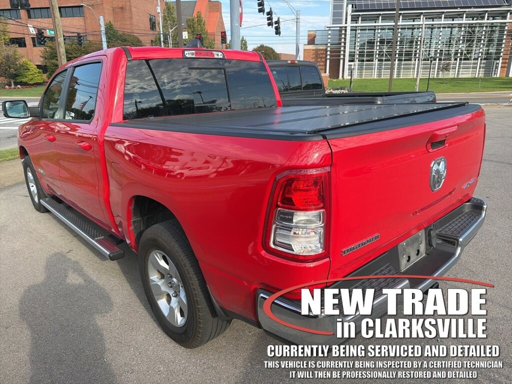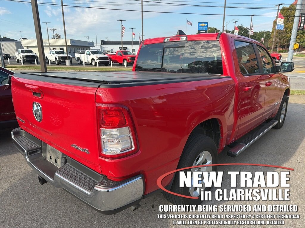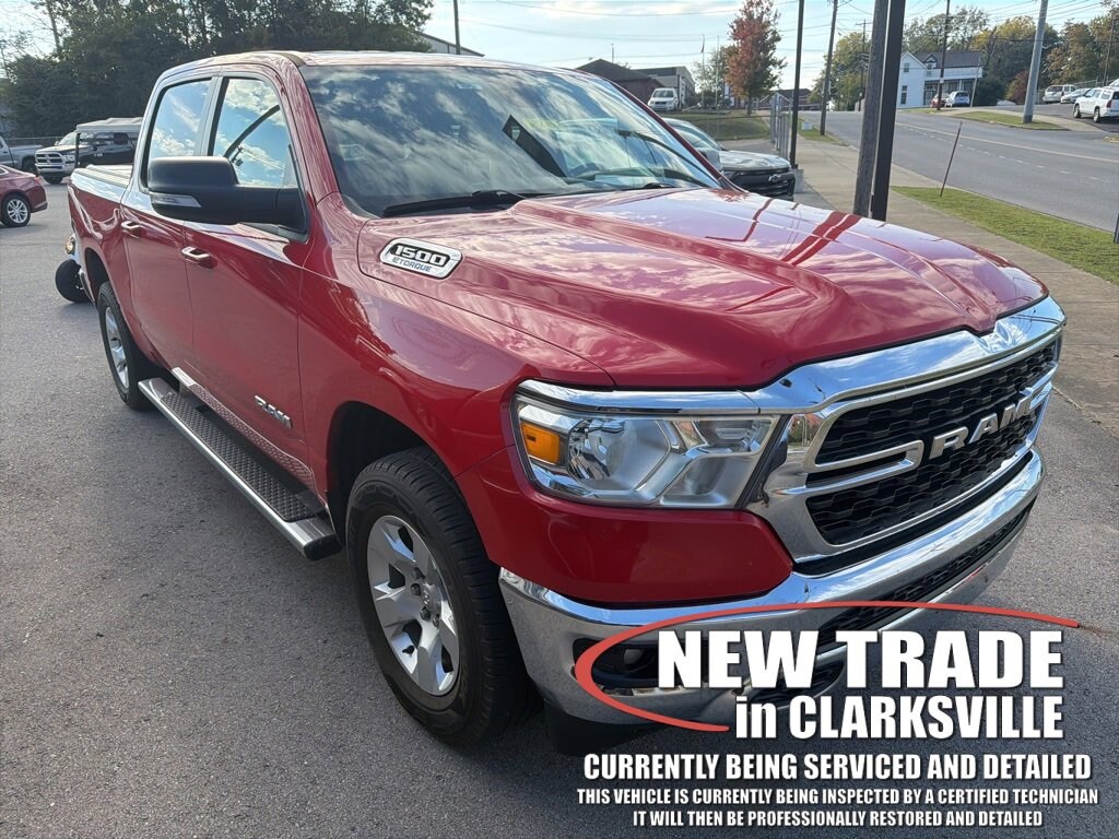 Local new car trade-in! Clean CARFAX. The Pre-Owned 2022 Ram 1500 Big Horn/Lone Star with 3.6L V6 24V VVT at Serra Clarksville. Well equipped: Big Horn Level 1 Equipment Group (2nd Row In Floor Storage Bins, 4G LTE Wi-Fi Hot Spot, 8.4 Touchscreen Display, Apple CarPlay, Auto-Dimming Exterior Driver Mirror, Auto-Dimming Rear-View Mirror, Black Exterior Mirrors, Black Premium Power Mirrors, Bluetooth Handsfree Phone & Audio, Class IV Receiver Hitch, Cluster 3.5 TFT Color Display, Connectivity - US/Canada, Convex Wide-Angle Mirror Insert, Exterior Mirrors Courtesy Lamps, Exterior Mirrors w/Heating Element, Exterior Mirrors w/Supplemental Signals, For Details, Visit DriveUconnect.com, Global Telematics Box Module (TBM), Glove Box Lamp, Google Android Auto, GPS Antenna Input, Integrated Center Stack Radio, Power 2-Way Driver Lumbar Adjust, Power 8-Way Driver Seat, Power Adjustable Pedals, Power-Folding Mirrors, Radio: Uconnect 5 W w/8.4 Display, Rear Dome w/On/Off Switch Lamp, Rear Power Sliding Window, Rear Window Defroster, SiriusXM Radio Service, SiriusXM Satellite Radio, Sun Visors w/Illuminated Vanity Mirrors, Universal Garage Door Opener, and USB Host Flip), Quick Order Package 23Z Big Horn (Big Horn Badge), 3 Rear Seat Head Restraints, 3.21 Rear Axle Ratio, 4 Way Front Headrests, 4-Wheel Disc Brakes, 48V Belt Starter Generator, 6 Speakers, ABS brakes, Air Conditioning, Alloy wheels, AM/FM radio, Brake assist, Bumpers: chrome, Cloth Bench Seat, Cluster 7.0 TFT Color Display, Compass, Delay-off headlights, Driver door bin, Dual front impact airbags, Dual front side impact airbags, Electronic Stability Control, Emergency communication system: SiriusXM Guardian, Front anti-roll bar, Front Center Armrest w/Storage, Front fog lights, Front License Plate Bracket, Front reading lights, Front Seat Back Map Pockets, Front wheel independent suspension, Fully automatic headlights, Heated door mirrors, Illuminated entry, Integrated Voice Command w/Bluetooth, Leather steering wheel, Low tire pressure warning, Occupant sensing airbag, Outside temperature display, Overhead airbag, Overhead console, Panic alarm, ParkView Rear Back-Up Camera, Passenger door bin, Passenger vanity mirror, Power door mirrors, Power steering, Power windows, Radio data system, Radio: Uconnect 3 w/5 Display, Rear 60/40 Folding Seat, Rear anti-roll bar, Rear seat center armrest, Rear step bumper, Rear Underseat Compartment Storage (DISC), Remote keyless entry, Speed control, Split folding rear seat, Steering wheel mounted audio controls, Tachometer, Telescoping steering wheel, Tilt steering wheel, Traction control, Trip computer, Variably intermittent wipers, Voltmeter, and Wheels: 18 x 8 Cast-Aluminum PainteD.