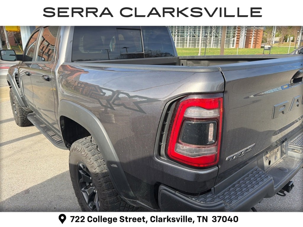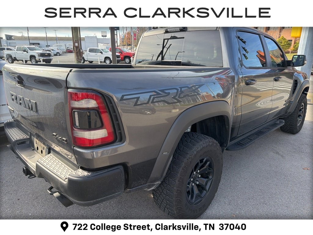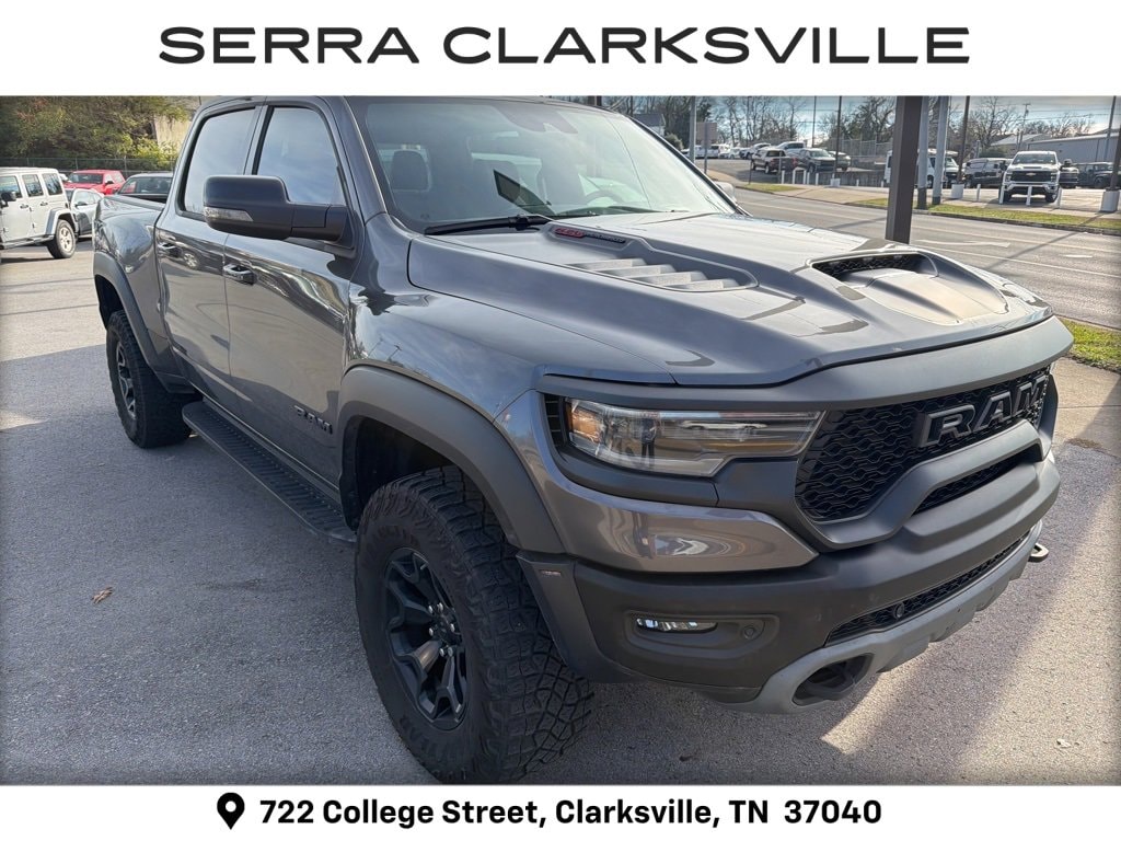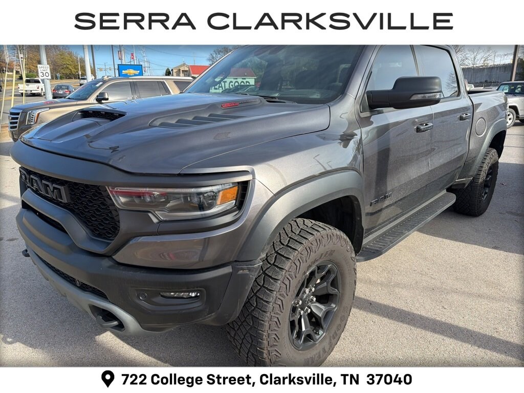 The Pre-Owned 2023 Ram 1500 TRX with 6.2L Supercharged HEMI V8 SRT at Serra Clarksville. Well equipped: Advanced Safety Group (Adaptive Cruise Control w/Stop & Go, Lane Keep Assist, Pedestrian Emergency Braking, and Tailgate Ajar Warning Lamp), Quick Order Package 29Y, Trailer Tow Group (Trailer Light Check and Trailer Tire Pressure Monitoring System), TRX Level 2 Equipment Group (#2 Seat Foam Cushion, 2-Door Passive Entry, Front Door Locks, 4 Way Front Headrests, Accent Color Door Handles, Blind Spot & Cross Path Detection, Bucket Seats, Center Console Parts Module, Digital Rearview Mirror, Driver Seat Memory, Driver/Passenger Wrapped Assist Handles, Exterior Mirrors w/Memory, Front Door Accent Lighting, Front Seat Back Map Pockets, Full Length Premium Upgraded Floor Console, Heads-Up Display, Heated Front Seats, Heated Second Row Seats, Heated Steering Wheel, IP LED Ambient Light Pipe, Leather Trimmed Bucket Seats, Leather/Suede Flat-Bottom Steering Wheel, LED CHMSL Lamp, Luxury Front Door Trim Panel, MOPAR Bright Pedal Kit, ParkSense Front/Rear Park Assist w/Stop, Pick-Up Box Lighting, Power 4-Way Driver Lumbar Adjust, Power 4-Way Passenger Lumbar Adjust, Power 8-Way Driver & Passenger Seats, Power Adjustable Pedals w/Memory, Premium Wrapped IP Bezel, Radio/Driver Seat/Mirrors/Pedals Memory, Rain Sensitive Windshield Wipers, Rear 60/40 Folding Seat, Rear 60/40 Folding Split Recline Seat, Rear Door Accent Lighting, Rear Underseat Compartment Storage, Rear Window Defroster, Remote Tailgate Release, Sun Visors w/Illuminated Vanity Mirrors, Surround View Camera System, Trailer Brake Control, Universal Garage Door Opener, Ventilated Front Seats, Ventilated Rear Seats, and Wireless Charging Pad), 10 Speakers, 3.55 Rear Axle Ratio, 4-Wheel Disc Brakes, ABS brakes, Adaptive suspension, Air Conditioning, Alloy wheels, AM/FM radio: SiriusXM with 360L, Apple CarPlay/Android Auto, Auto High-beam Headlights, Auto-dimming door mirrors, Auto-dimming Rear-View mirror, Automatic temperature control, Black Exterior Mirrors, Brake assist, Cloth/Vinyl Bucket Seats, Compass, Delay-off headlights, Driver door bin, Dual front impact airbags, Dual front side impact airbags, Electronic Stability Control, Exterior Mirrors Courtesy Lamps, Exterior Mirrors w/Heating Element, Exterior Mirrors w/Supplemental Signals, Front anti-roll bar, Front Bucket Seats, Front Center Armrest w/Storage, Front dual zone A/C, Front fog lights, Front reading lights, Front wheel independent suspension, Fully automatic headlights, harman/kardon 19 Speaker Premium Sound (DISC), Heated door mirrors, Illuminated entry, Leather Shift Knob, Leather steering wheel, Low tire pressure warning, Navigation System, Occupant sensing airbag, Outside temperature display, Overhead airbag, Overhead console, Panic alarm, ParkView Rear Back-Up Camera, Passenger door bin, Passenger vanity mirror, Power door mirrors, Power driver seat, Power steering, Power windows, Power-Folding Mirrors, Radio data system, Radio: Uconnect 5 Nav w/12.0 Display, Rear seat center armrest, Rear step bumper, Remote keyless entry, Security system, Speed control, Split folding rear seat, Sport steering wheel, Steering wheel mounted audio controls, Tachometer, Telescoping steering wheel, Tilt steering wheel, Traction control, Trip computer, Turn signal indicator mirrors, Variably intermittent wipers, Voltmeter, and Wheels: 18 x 9 Black Paint/Polish Aluminum.