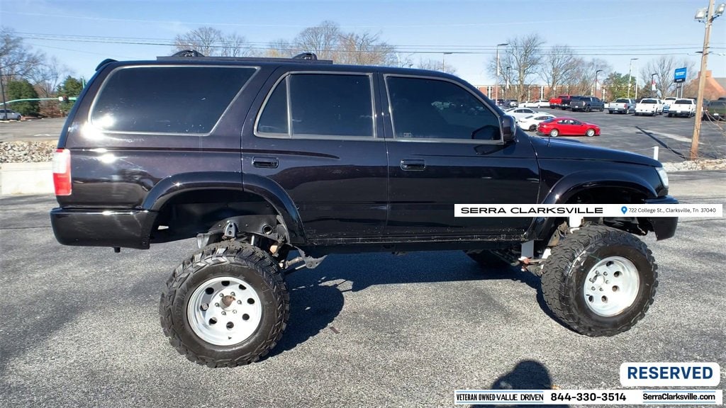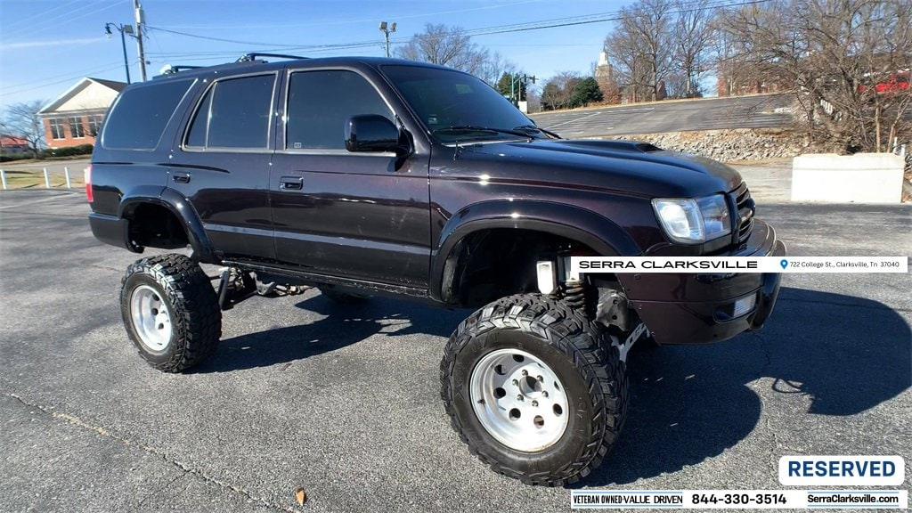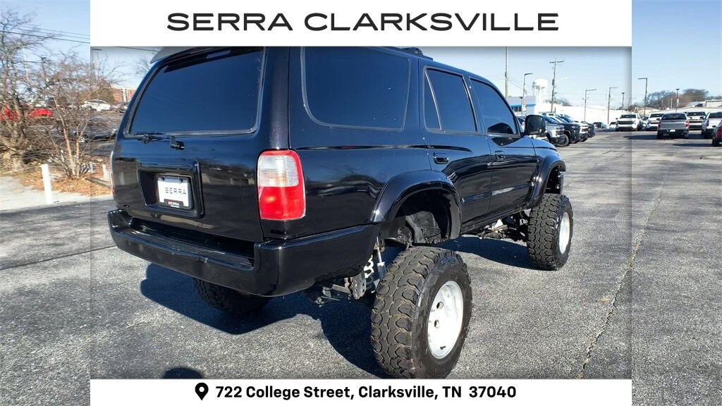 The Pre-Owned 2000 Toyota 4Runner SR5 with 3.4L V6 at Serra Clarksville. Well equipped: 3.4L V6, 4WD, Cloth, 4 Speakers, ABS brakes, AM/FM radio, Bumpers: chrome, Cassette, CD player, Cloth Bucket Seats, Driver door bin, Dual front impact airbags, Front anti-roll bar, Front Bucket Seats, Front Center Armrest w/Storage, Front reading lights, Front wheel independent suspension, Heated door mirrors, Overhead console, Passenger door bin, Passenger vanity mirror, Power door mirrors, Power steering, Rear anti-roll bar, Rear window defroster, Rear window wiper, Speed control, Speed-sensing steering, Split folding rear seat, Tachometer, Tilt steering wheel, and Variably intermittent wipers.